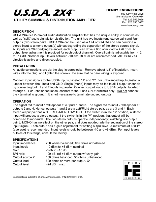 USDA 2X4 is a 2-in/4-out audio distribution amplifier that has the unique ability to combine as
