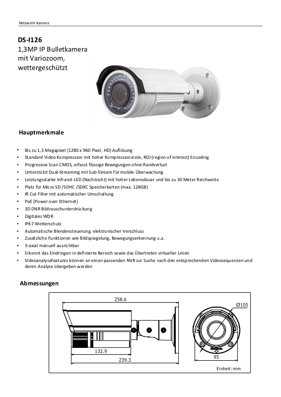 Netzwerkprotokolle TCP/IP, UDP, ICMP, HTTP, HTTPS, FTP, DHCP, DNS, DDNS, RTP, RTSP, RTCP, PPPoE, NTP, UPnP, SMTP,