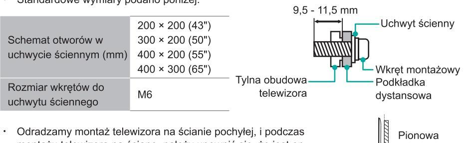 montażu telewizora na ścianę, należy upewnić się, że jest on ustawiony równolegle do ściany i nie przechyla się do przodu.