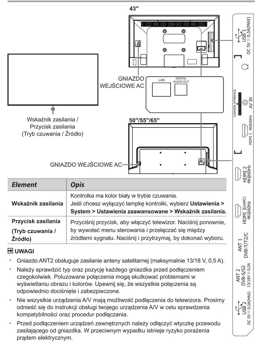 Odbiorniki telewizyjny wyposażony w instrukcję obsługi oraz wbudowaną instrukcję elektroniczną (Ustawienia > Wsparcie > E-Instrukcja).
