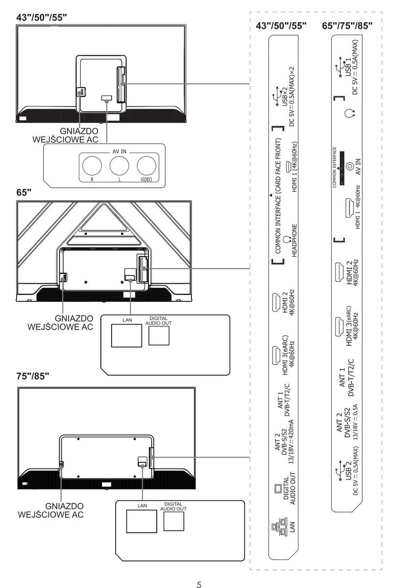 Gniazdo ANT2 obsługuje zasilanie anteny satelitarnej (maksymalnie 13/18 V, 420 mA). (43"/50"/55")