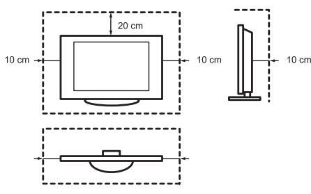Instaluj telewizor tylko wtedy, gdy jest wystarczająca wentylacja i zapewnij wolną przestrzeń wynoszącą co najmniej 10 cm po bokach i 20 cm nad jednostką dla cyrkulacji powietrza. Nadmierna utrata ciepła i wentylacji może prowadzić do pożaru lub przedwczesnej awarii niektórych elementów elektrycznych.