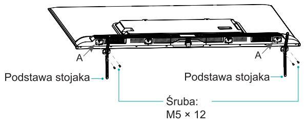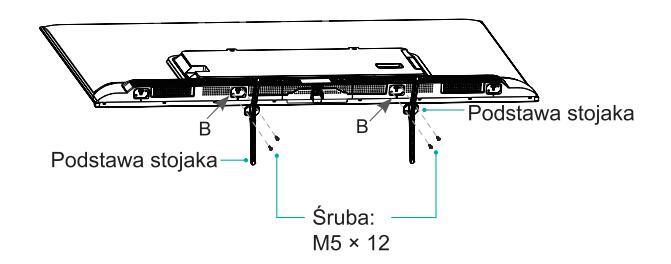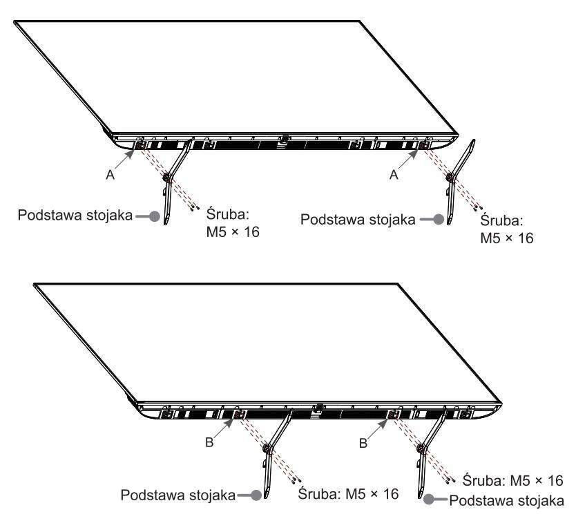 Uwaga: jeśli stół jest odpowiednio długi, aby umieścić na nim telewizor, włóż podstawki stojaka do otworów na śruby "A" przedstawionych na ilustracji. Jeśli stół NIE jest dość długi, aby umieścić na nim telewizor, włóż stojak do otworów na śruby "B" przedstawionych na ilustracji. Pamiętaj, że nie można połączyć obu sposobów montażu.