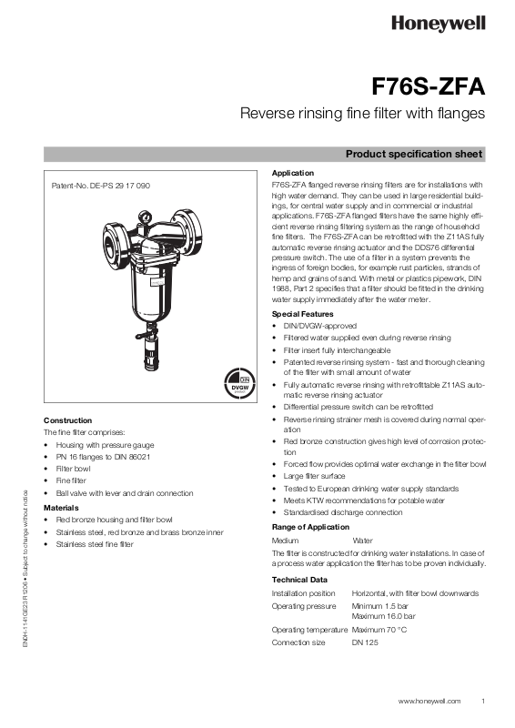 applications. F76S-ZFA flanged filters have the same highly efficient reverse rinsing filtering system as the range of household