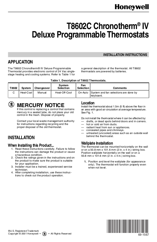 Thermostat provides electronic control of 24 Vac singlestage heating and cooling systems. Refer to Table 1 for