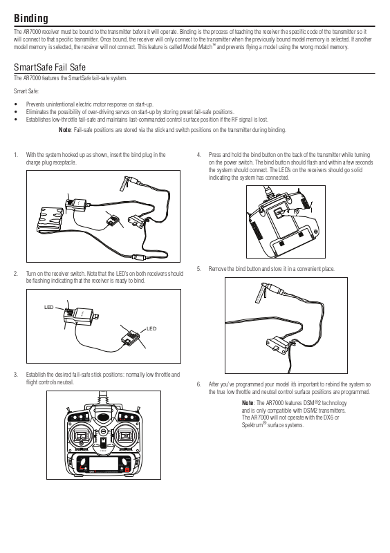 The AR7000 receiver must be bound to the transmitter before it will operate. Binding is the process of teaching the receiver the specific code of the transmitter so it
