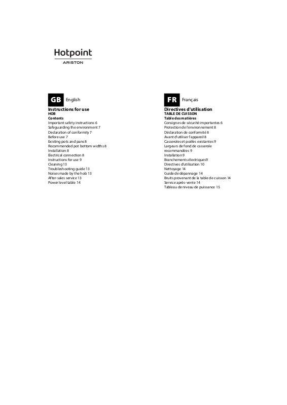 Ces directives sont également disponibles sur le site web : www.hotpoint.eu