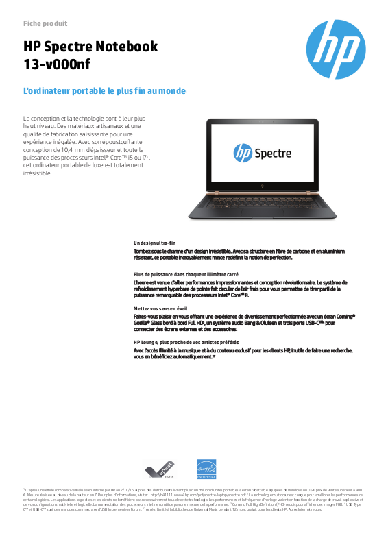 €. Mesure réalisée au niveau de la hauteur en Z. Pour plus d'informations, visitez: http://h41111.ww w4.hp.com/pdf/spectre-laptop/spectre.pdf2La technologie multicœur est conçue pour améliorer les performances de