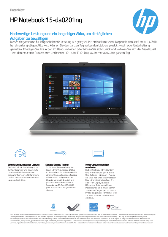 LiveSafe, kostenlose 30-Tage-Testversion(Internetzugang erforderlich. Dieersten 30 Tage sindinbegriffen. Anschließend istfür Live-Updates einAbonnement erforderlich.)3Geschätzte Windows10-Akkunutzungsdauer basierendauf Windows 10/ MobileMark® 2014Benchmark. Die