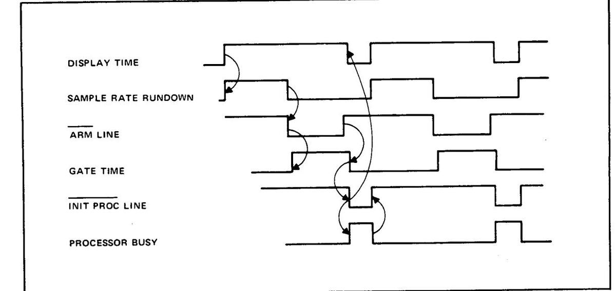 4-195. COMPUTER DUMP. Computer Dump causes the Denominator Register and Numerator Register to output data directly from the scalers. When addressed to computer dump, U5B sets and forces the FORCED ARM line Low, via U33B. This line bypasses sample rate and forces the counter to make measurements at its fastest possible rate. The COMP DUMP line goes Low and prevents the counter from entering the arithmetic process.