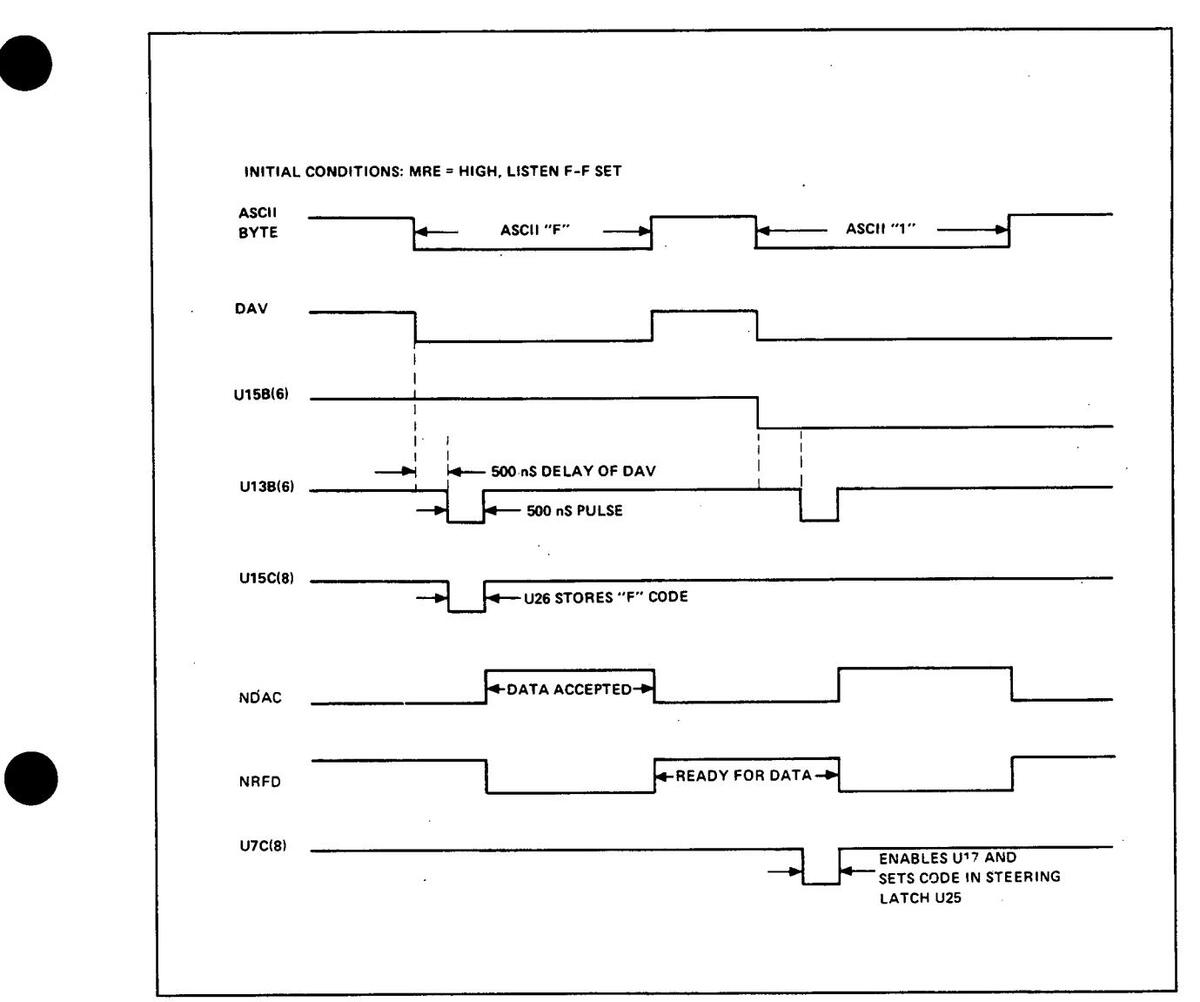 4-199. REGISTER STORAGE OPERATION. The following description concerns an exchange of data between the Numerator Register (NR) and the Denominator Register (DR). The description serves an as explanation for the three registers in general. Each digit of Time Scaler data and Events Scaler data is represented as a 4-bit code. The RAMs are capable of storing 16 of these codes in separate locations (or addresses). The RAM counter that is enabled to count produces a new code with each negative transition of REG CLK. Each new code selects a different RAM location. Once the location is selected, data contained in the location can be read out while REG CLK is Low. If the data source code for the RAM is other than "READ", new data is written into the RAM when REG CLK goes High. Shifting data from one RAM to another requires switches to control the data flow and latches to store data during the write operation. Assuming data has been written into the RAMs from the scalers, a later ROM cycle exchanges data between NR and DR (a frequency measurement). This operation appears as follows.