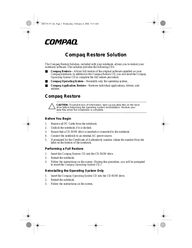 The Compaq Restore Solution, included with your notebook, allows you to restore your
