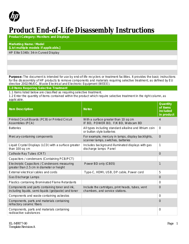 for the disassembly of HP products to remove components and materials requiring selective treatment, as defined by EU