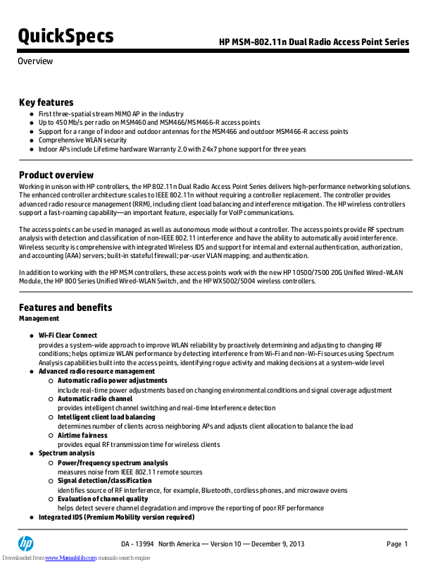 includes dual-radio IEEE 802.11a/b/g/n and 802.11a/n access points; per-radio software-selectable configuration of frequency