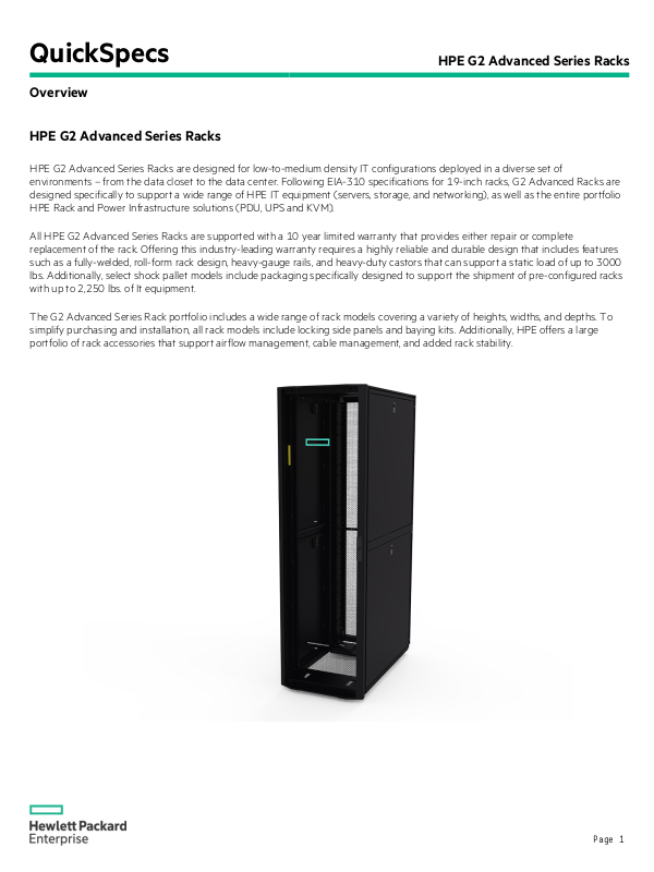 HPE G2 Advanced Series Racks are designed for low-to-medium density IT configurations deployed in a diverse set of