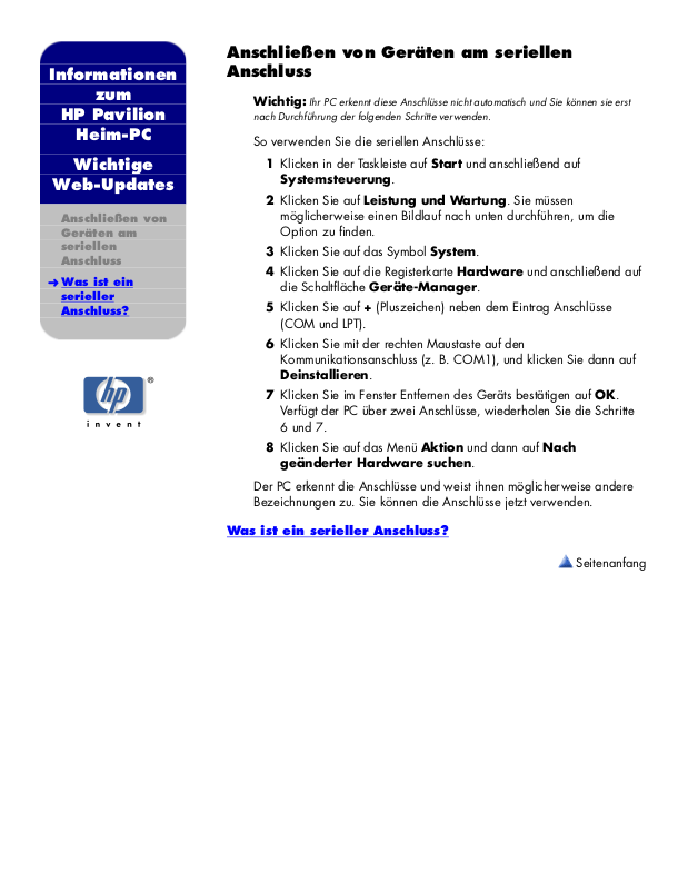 Ihr HP Pavilion Heim-PC verfügt über einen oder zwei serielle Anschlüsse