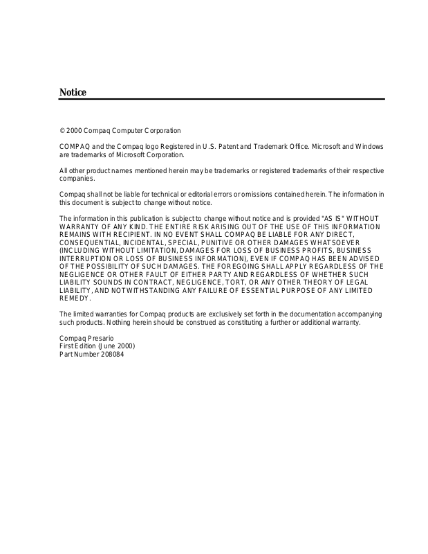 The limited warranties for Compaq products are exclusively set forth in the documentation accompanying