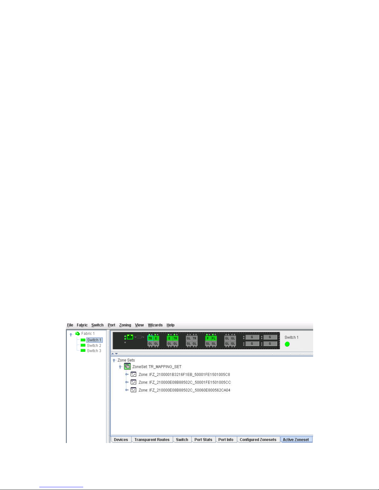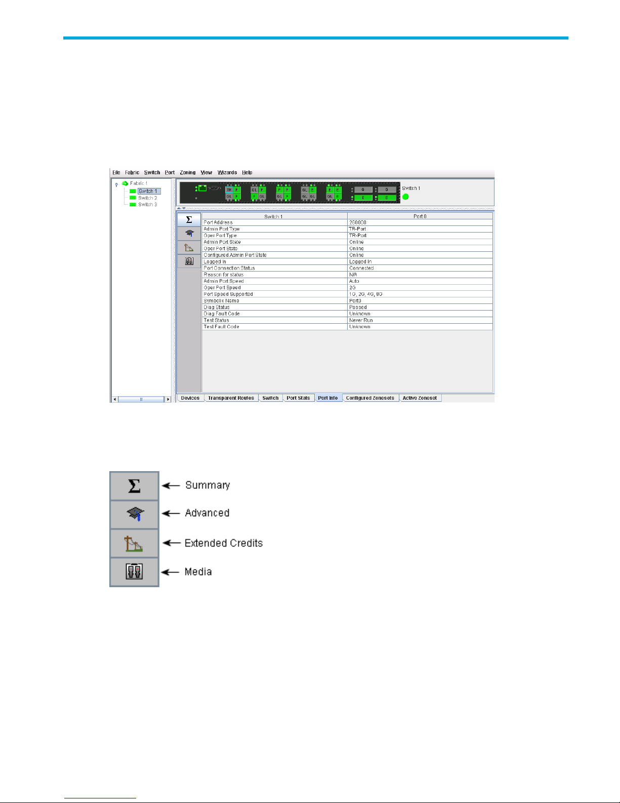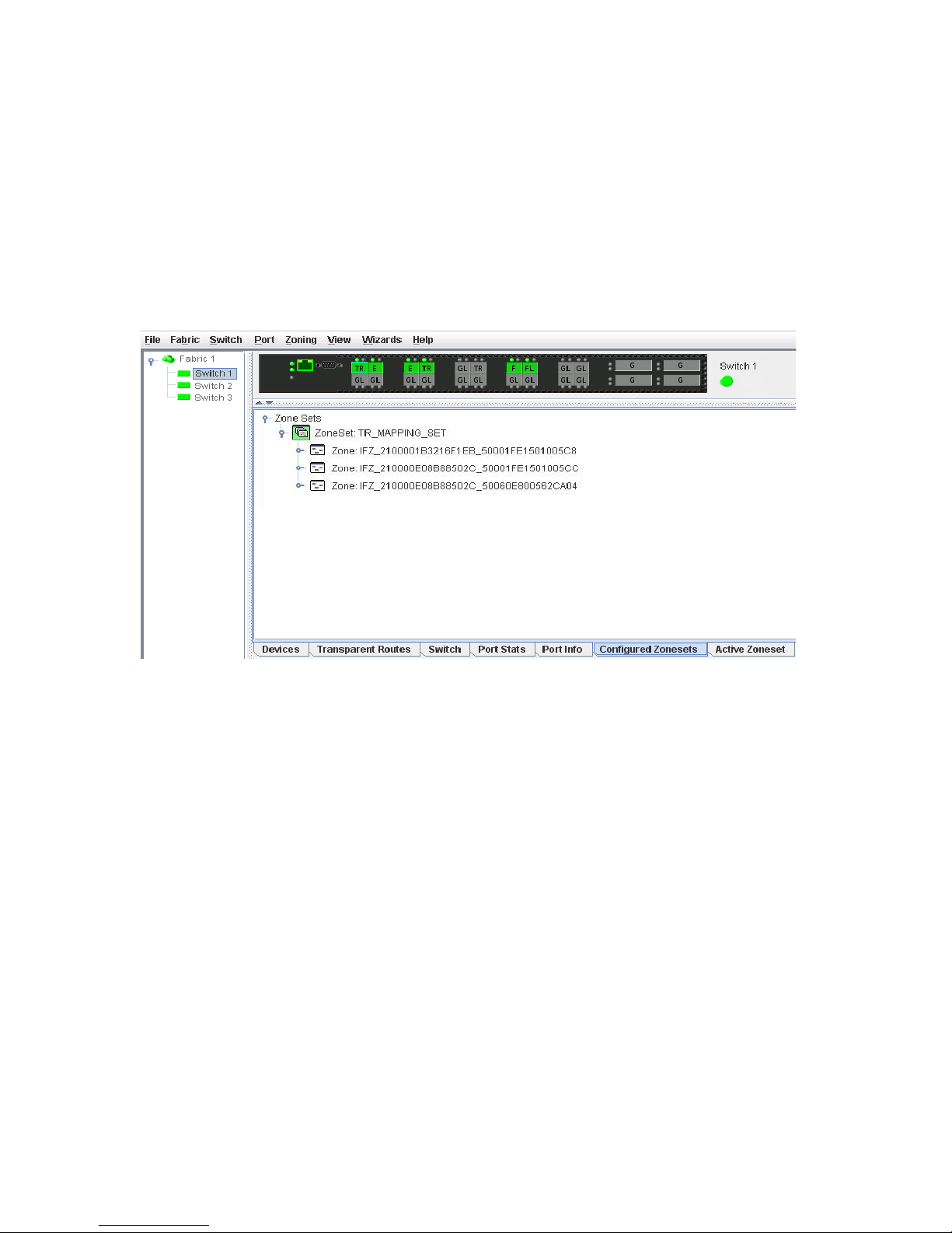 front of a single switch and its ports. While there is no topology display, the fabric name is displayed for