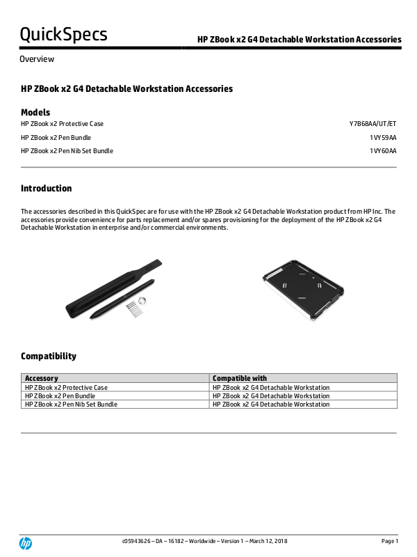 The accessories described in this QuickSpec are for use with the HP ZBook x2 G4 Detachable Workstation product from HP Inc. The