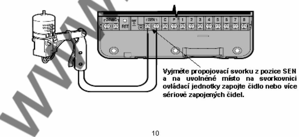 Čídlo na svorkovnici ovládací jednotky zůstává zapojeno do pozice SEN, propojovací svorku odstraňte. Při aktivaci čídla dojde k zablokování pouze některých elektromagnetických ventilů. Ostatní ventily jsou trvale v provozu bez ohledu na čídlo. Toto je možné díky tomu, že ovládací jednotky XC jsou jako první ovládací jednotky Hunter vybaveny funkcí programovatelného zablokování čídla pouze pro určítou konkrétní sekci nebo pro vybranou skupinu více sekcí. Při aktivaci čídla nedojde k zablokování závlahy u sekcí, na kterých nastavíte vypnutí funkce čídla. Tyto sekce jsou trvale v provozu bez ohledu na stav čídla.