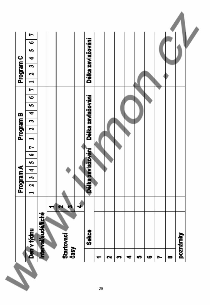 Poznamka: Vymazání všech naprogramovaných dat včetně paměti procesoru je vhodné použít i v případech, kdy dojde vinou chyby procesoru k zablokování závlahy či pouze některého z elektromagnetických ventilů nebo funkcí programování.