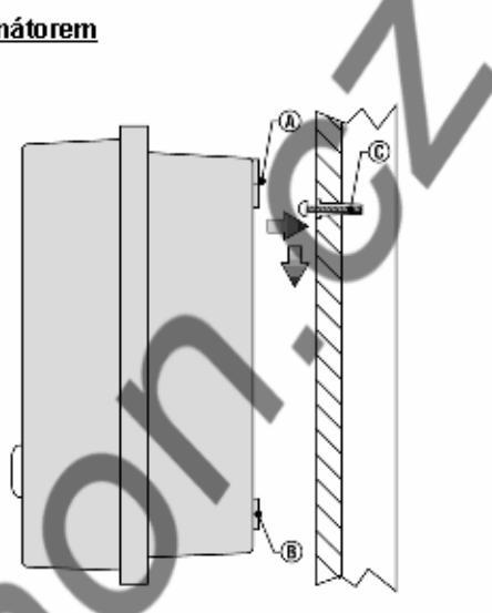 Ovládací jednotka se připevňuje na zeď pomocí tří vrutů 4mm (A) skrz připravené otvory v zadní části plastové schránky. Horní otvor (B) umožňuje snadné zavěšení a vystředění, spodní otvory (C) zajistí jednotku proti vysunutí.