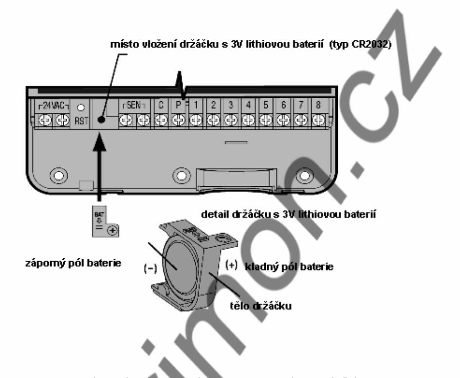 Záložní zdroj 3 V zachová v ovládací jednotce běh reálného času a umožňuje programování jednotky, není ale schopen ovládat hlavní ani sekční elektromagnetické ventily.