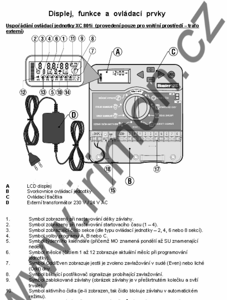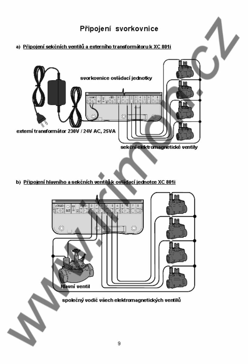 UPOZORNĚNÍ: K ovládací jednotce nikdy nepřipojujte současně více než tři elektromagnetické ventily (1 hlavní + 2 sekční). Současné sepnutí více než tří elektromagnetických ventilů může způsobit poškození transformátoru případně elektrických obvodů ovládací iednotky !