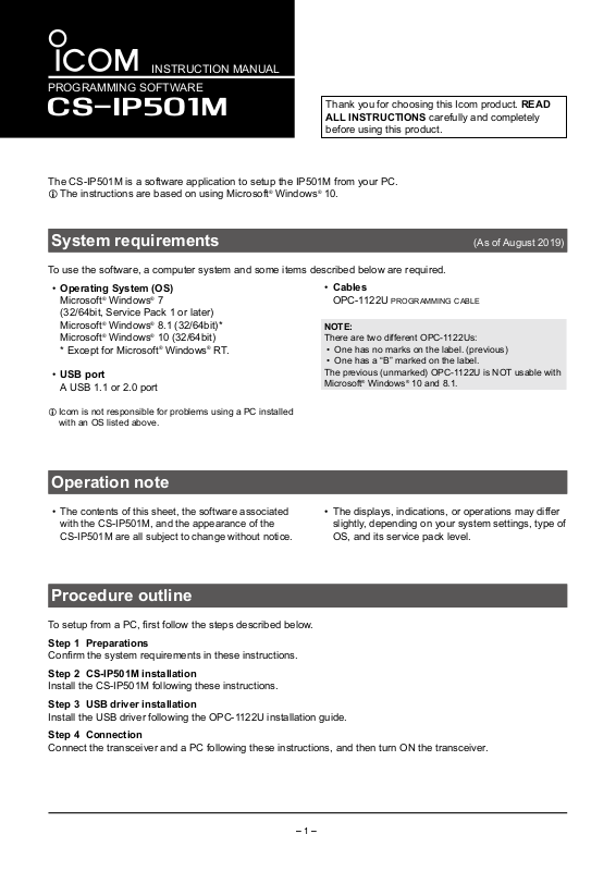 Before you use the OPC-1122U programmingcable, you must install its USB driver. The driver is supplied with
