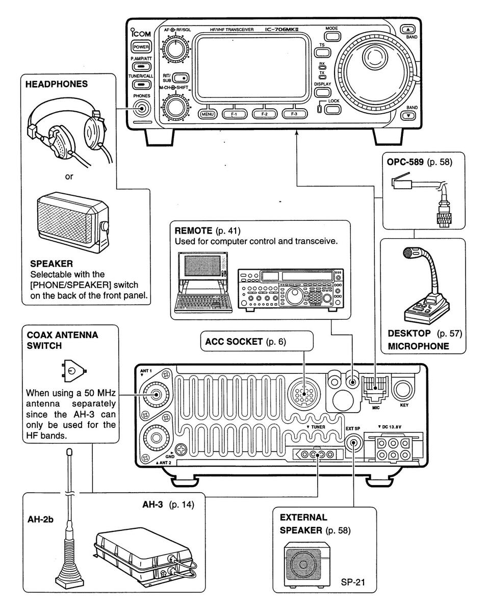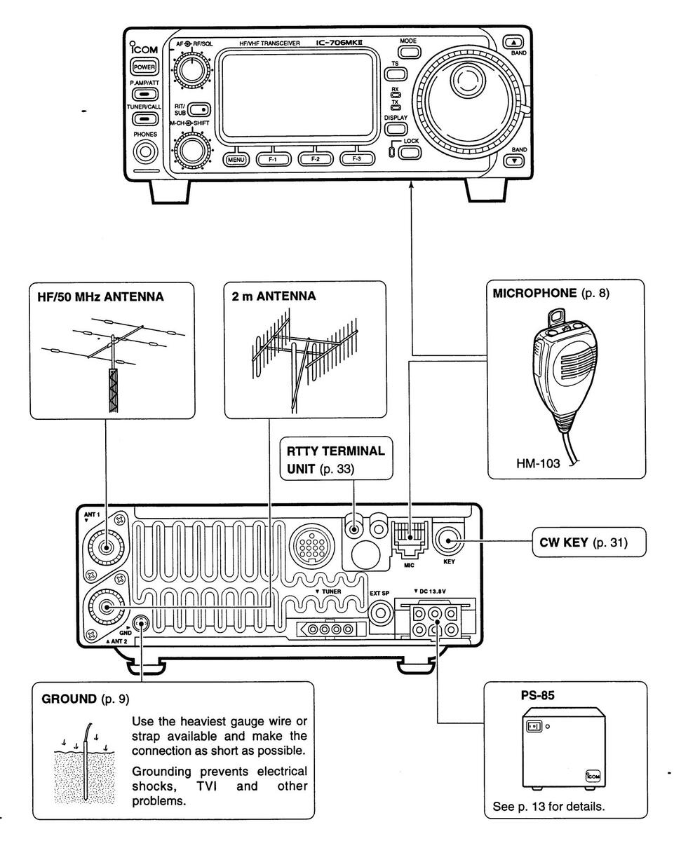 Use Icom microphones only (supplied or optional). Other manufacturer's microphones have different pin assignments and connection to the IC-706MKII may damage the transceiver.
