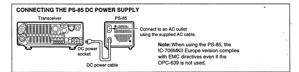 The IC-706MKII Europe version complies with essential requirements of the 89/336/EEC directive for Electromagnetic Compatibility under the conditions listed below. This compliance is based on conformity with the ETSI specification ETS300 684 Jan. 1997 (EMC product standard for Commercially Available Amateur Radio Equipment).