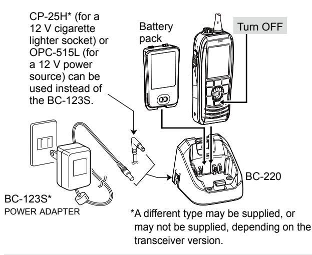 Even when the transceiver power is OFF, a slight current still flows in the circuits. Remove the battery pack from the transceiver when not using it for a long time. Otherwise, the installed battery pack or batteries will become exhausted, and will need to be recharged or replaced.