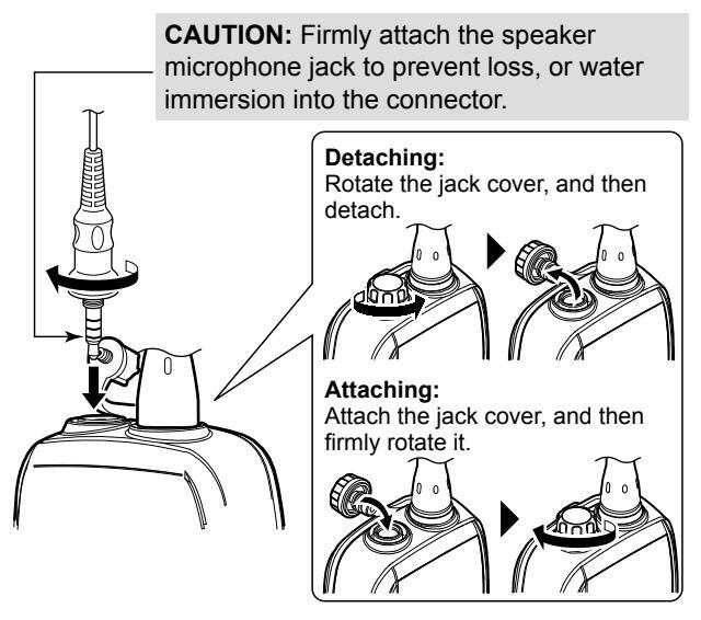 CAUTION: DO NOT attach the battery unless the flexible antenna, battery pack and jack cover are securely attached to the transceiver. Confirm that the antenna and battery pack are dry before attaching. Exposing the inside of the transceiver to dust or water can cause serious damage to the transceiver.