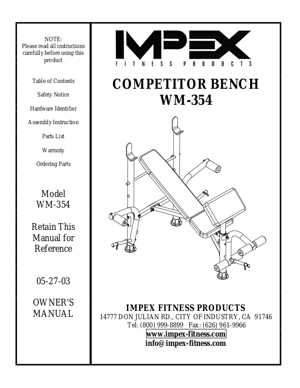 Thank you for selecting the COMPETITOR WM-354 Bench by IMPEX