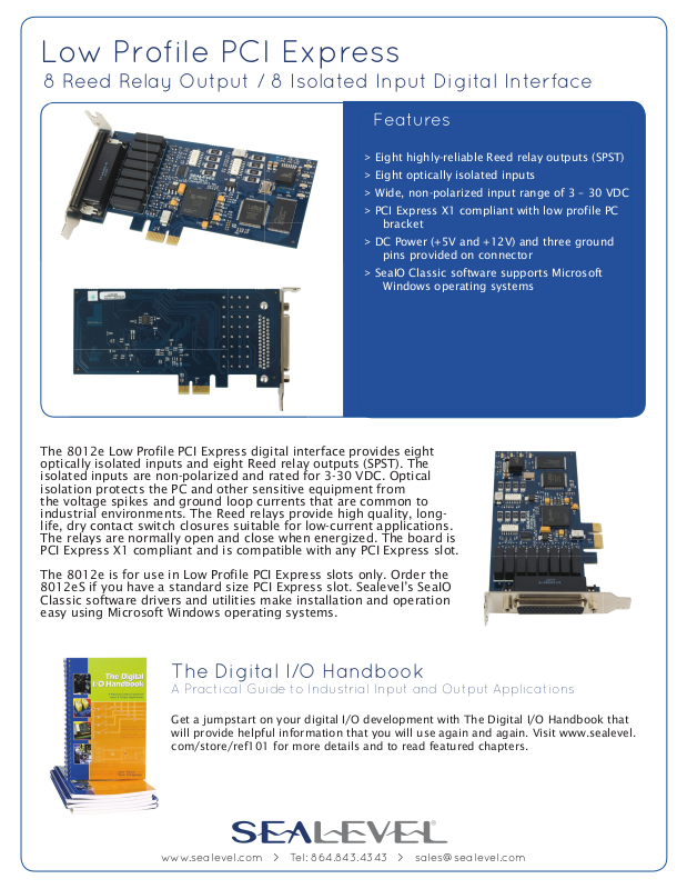 Sealevel PCI Express digital I/O boards are designed for computers with X1 PCI Express slots and are compatible with any PCI Express slot. Digital I/O boards are currently available with optically isolated inputs and Reed