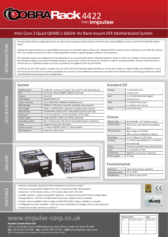 Ulising the popular Intel Core 2 Quad Q9400 processor and Intel Q45 system chipset, the CobraRack-4422 is ideal for users looking for a cost effecve soluon