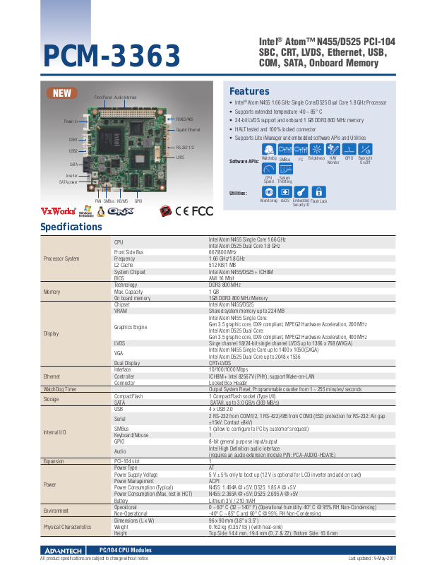 Power Consumption (Typical) N455: 1.404A @ +5V; D525: 1.85 A @ +5V