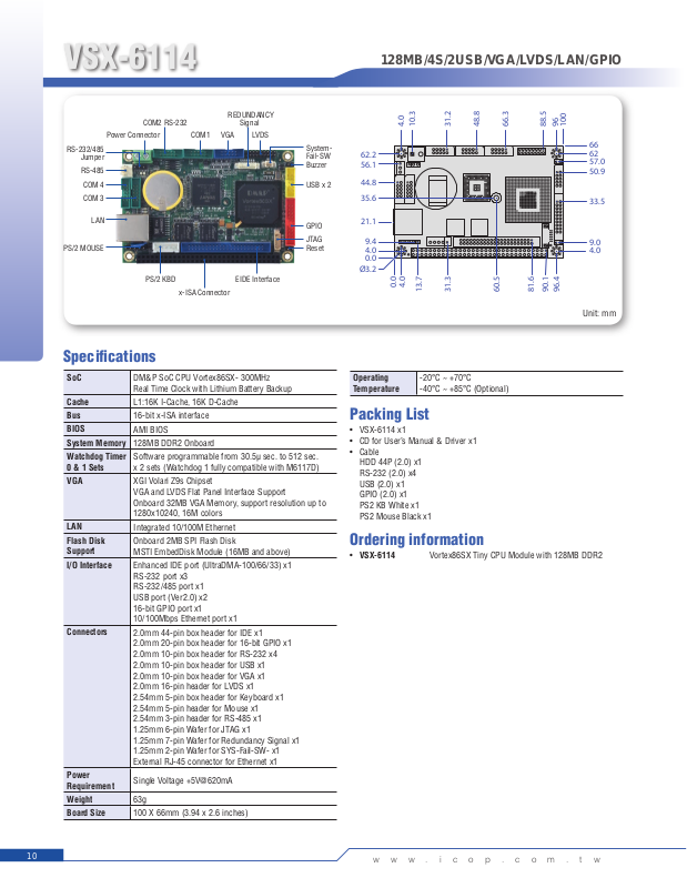 • VSX-6114 Vortex86SX Tiny CPU Module with 128MB DDR2