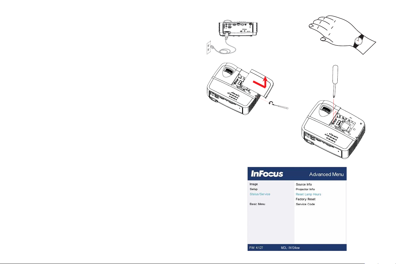 11 To reset the lamp hour timer, navigate to the Advanced Menu > Status/Service