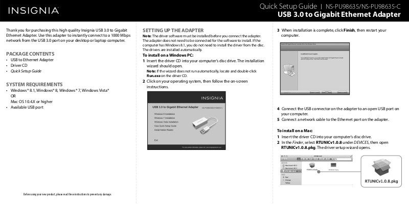 Thank you for purchasing this high quality Insignia USB 3.0 to Gigabit