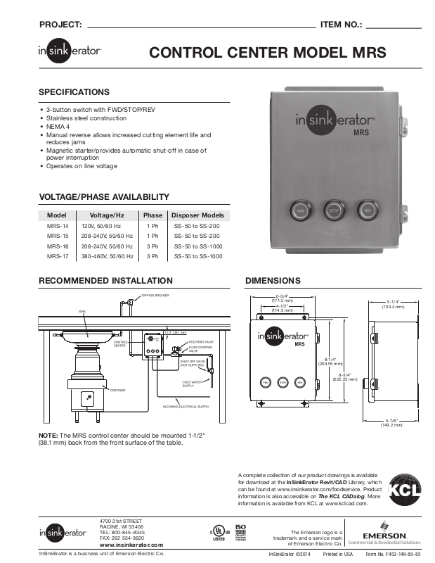 InSinkE rator ©2 014 Printed in U SA For m No. F45 3-14K-89-85