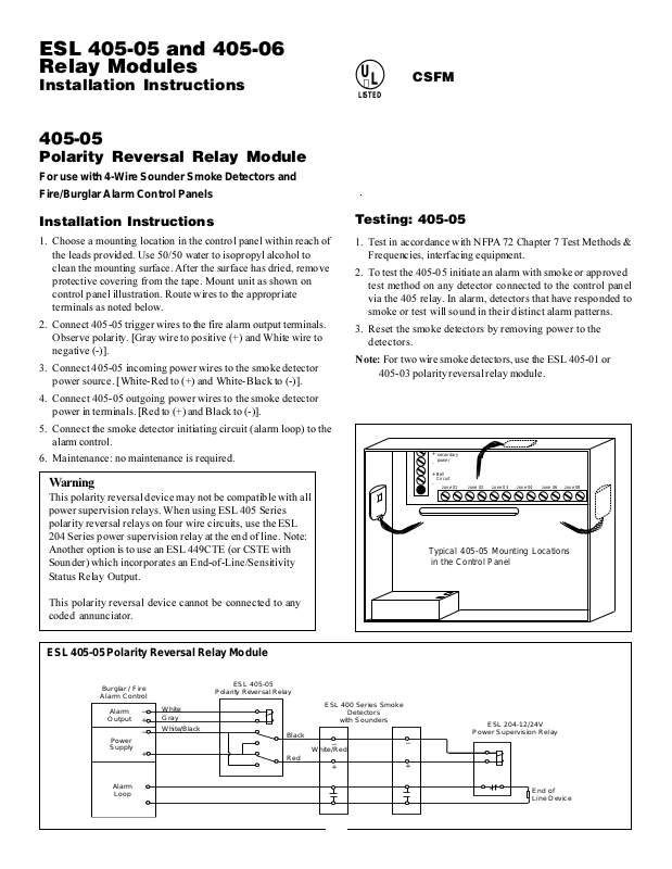 Note: For two wire smoke detectors, use the ESL 405-01 or