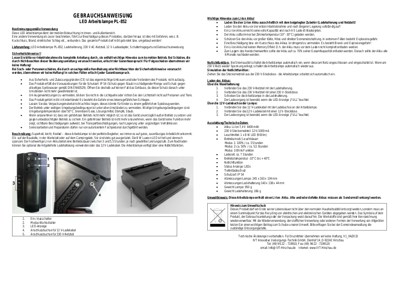 Delivery cont en t: LED work lamp PL-852, charging base, power supply, 12 V- charging cable, shoulder strap a nd operating instructions.