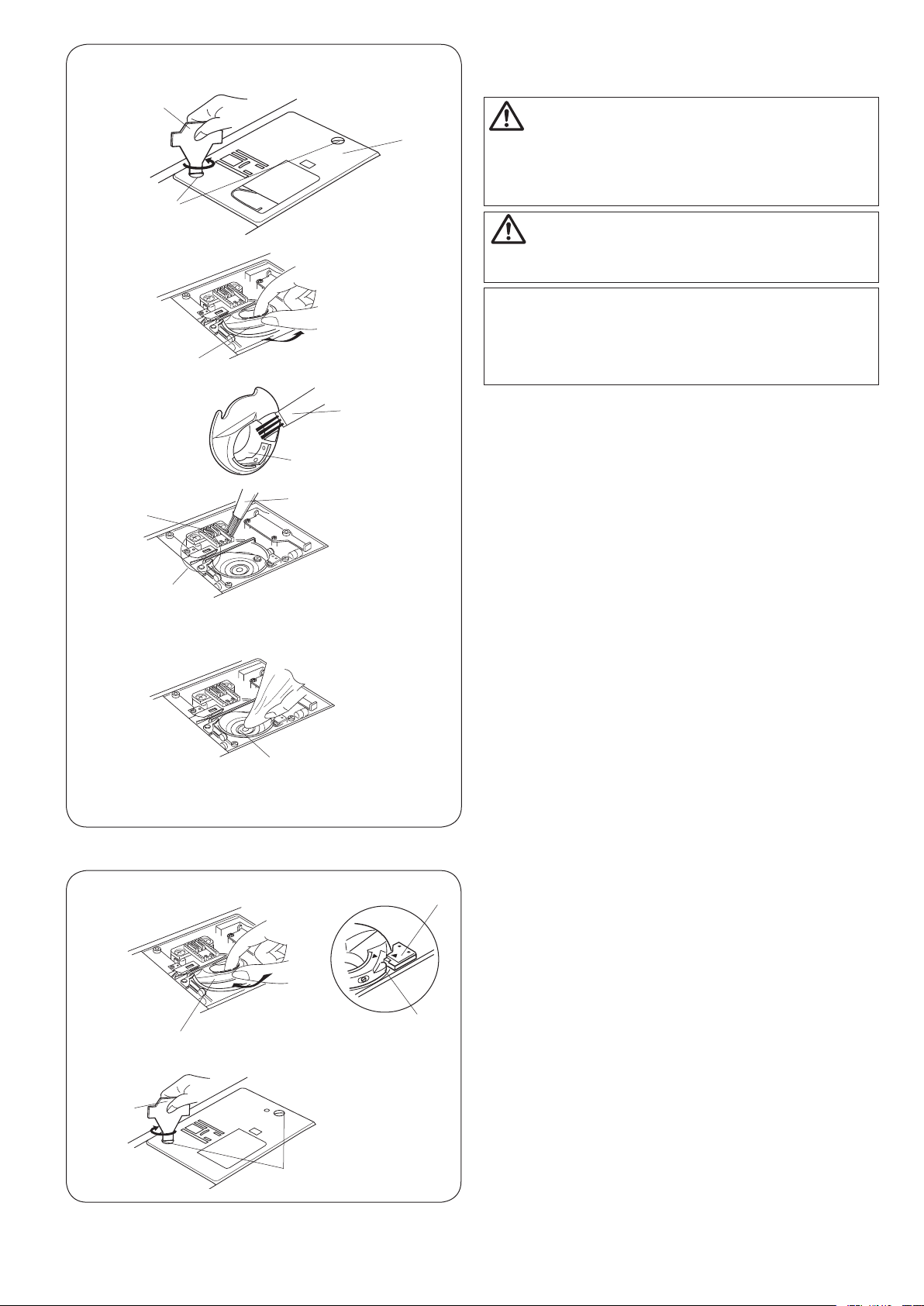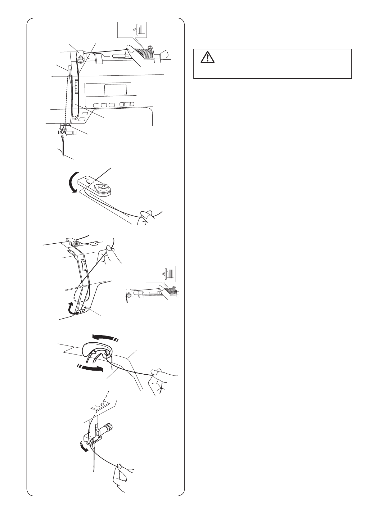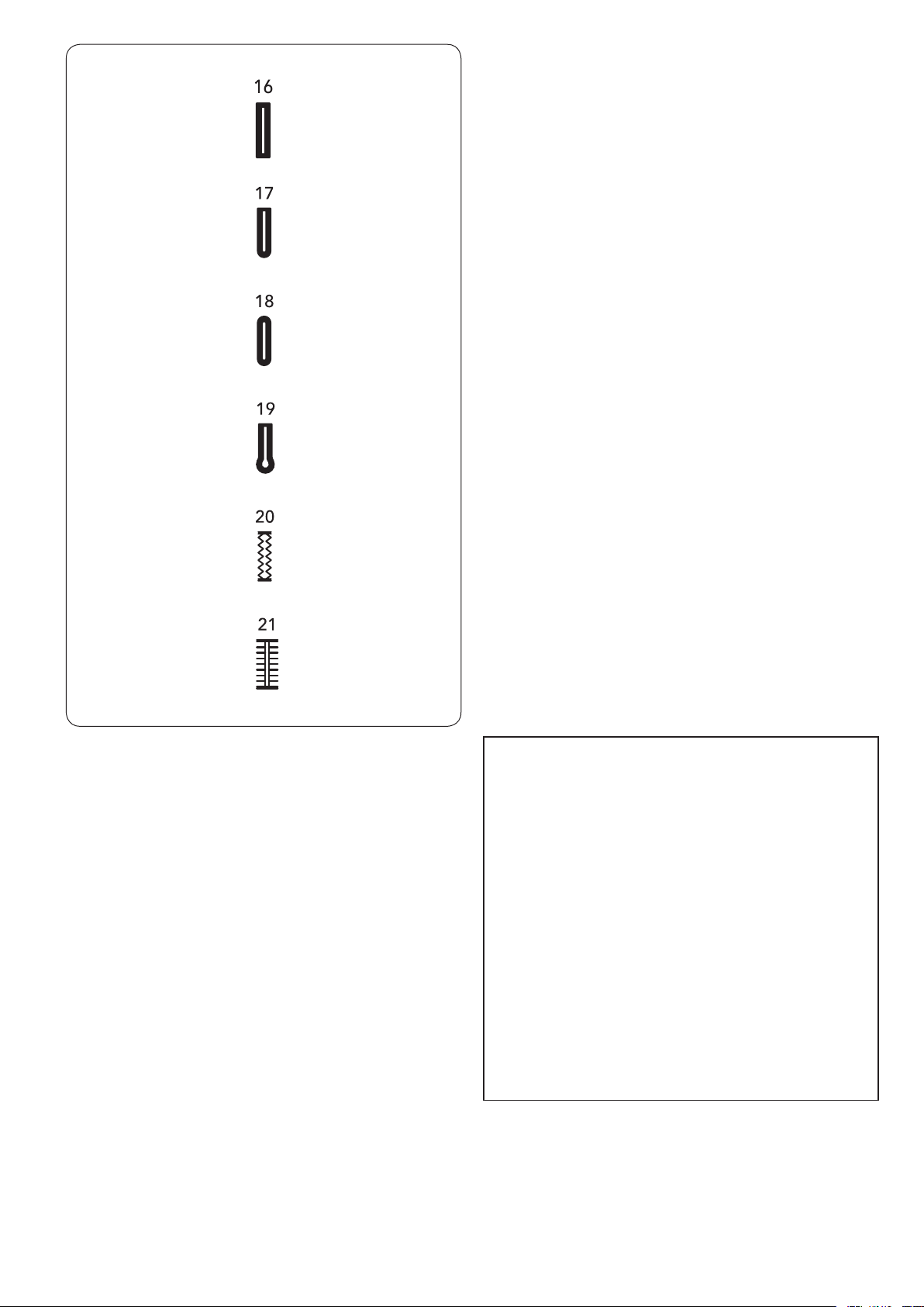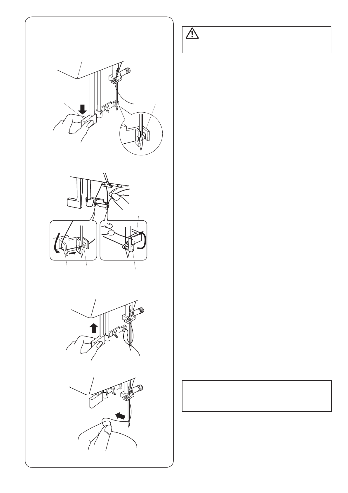 14. Switch this sewing machine off (“O”) when making any adjustment in the needle area, such as