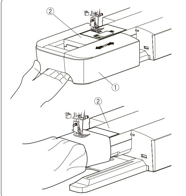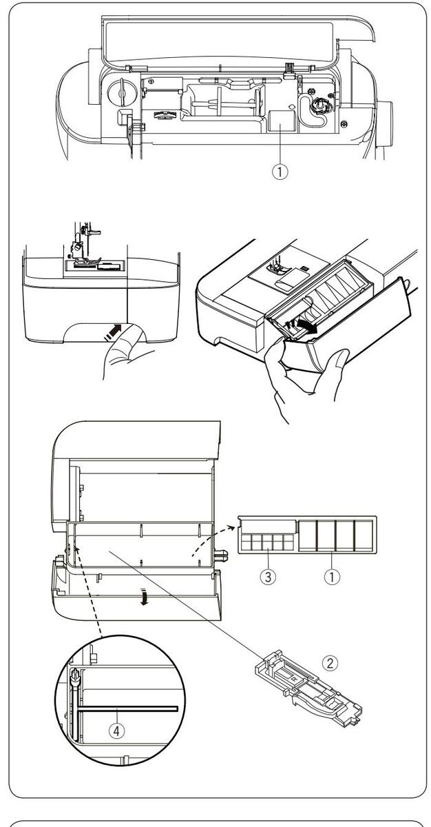 Płytkę prowadnicy, znajdującą się pod pokrywą maszyny, należy czyścić nie rzadziej niż raz w miesiącu. I Zdejmij nić od igły, a nastepnie zdejmij płytkę prowadnicy