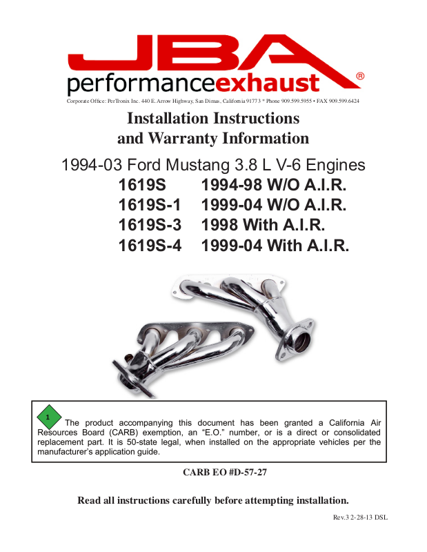 PerTronix© thanks you for choosing JBA Headers, the best fitting, highest quality header on the market. In order to realize the full potential of our good fit, please read and understand these instructions