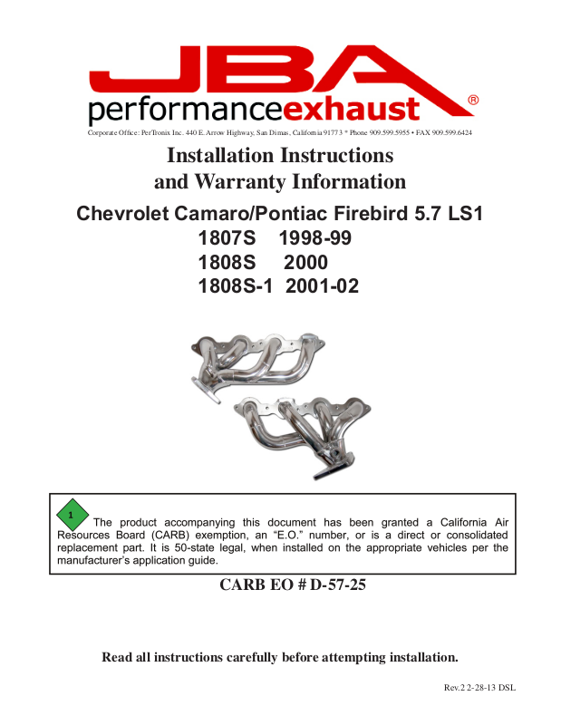 PerTronix© thanks you for choosing JBA HEADERS, the best fitting, highest quality header on the market. In order to realize the full potential of our good fit, please read and understand these instructions