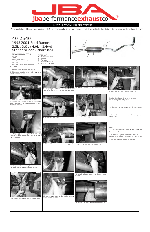 * Installation Recommendation: JBA recommends in most cases that the vehicle be taken to a reputable exhaust shop.