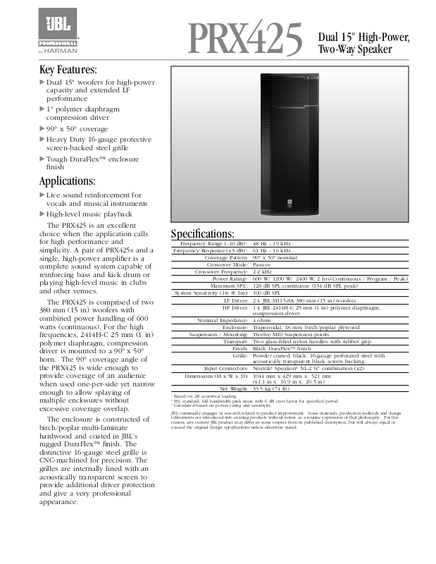 䉴 PRX425 Dual 15" High-Power, Two-Way Speaker