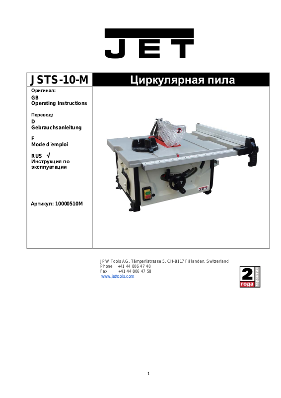 составлена для владельцев и пользователей циркулярной пилы JET JSTS-10-M, чтобы обеспечить безопасность при